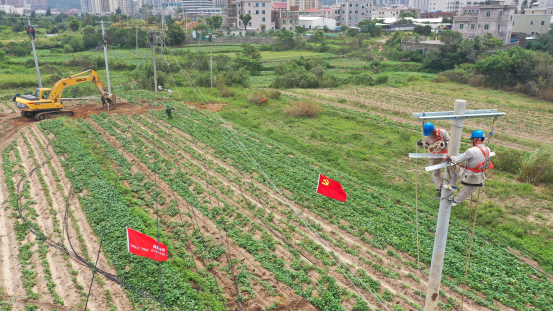 图为7月30日,国网三明供电公司组织“双满意”员服务队在泉州市惠安县10千伏崇山线展开立杆架线作业。唐伟/摄