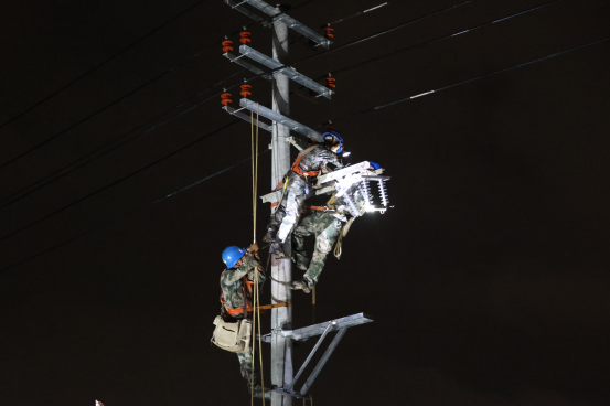 图为7月29日,国网建宁县供电公司抗击“杜苏芮”飓风跨区援助团队在惠安县10千伏三村线、石井线(同杆双回)展开抢修作业,连夜装置真空开关。朱德栗/摄